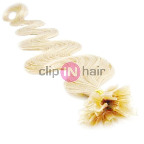 Vlnité prameny 100% lidských vlasů s keratinovým zakončením. Již připravené k aplikaci.